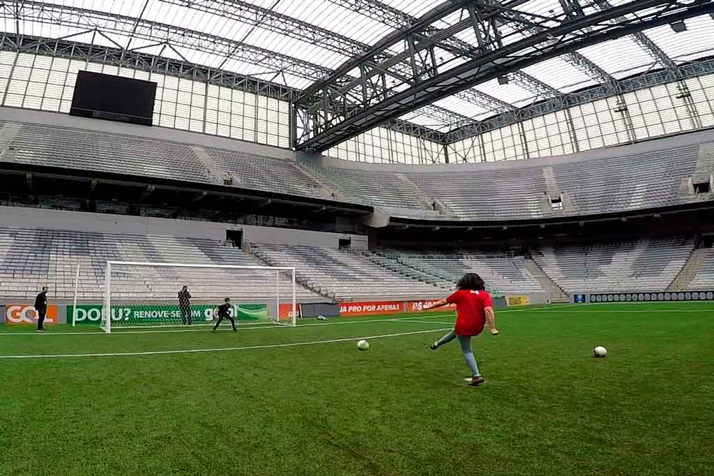 Além de fazer o Tour, tivemos um momento exclusivo ao poder pisar no gramado e chutar a gol. Eu fiquei emocionada só de pisar em um gramado de um estádio de copa do mundo, imagine chutar a gol. Foi incrível! Coisas que só uma visita como blogueira de viagem nos proporciona. Me senti privilegiada mais uma vez 🙂 .
